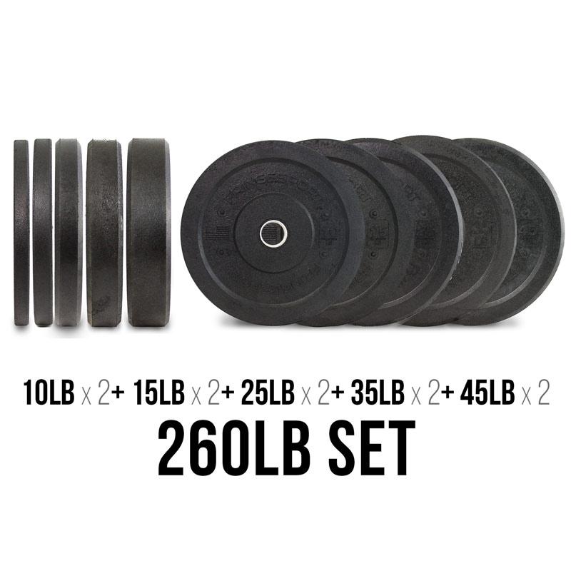 10/15/25/35/45 - 260lbs: This 260 pound full set of bumper plates is a must for the well-stocked home gym. Multiple sets are great for commercial gyms as well. This set comes with 5 pairs of crumb bumpers- one set each of 10 pound, 15 pound, 25 pound, 35 pound, and 45 pound plates.