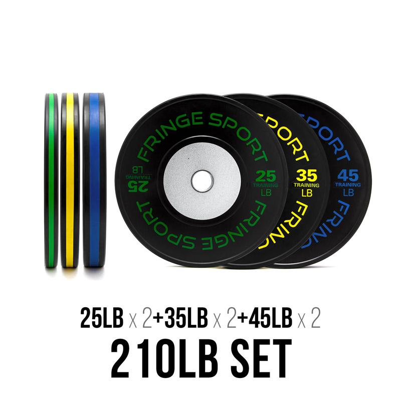 We developed our own brand of durable and affordable weightlifting bars and competition bumper plates. The Fringe Sport Oly barbells provide great spin for Olympic lifting and the black plates with, not only color contrast labeling but also a color band on the outside rim, make it easy to read and switch out weight. These bumpers can withstand the test of time and have a dead bounce. We have three plate sets available but if you want to customize your own shoot us an email or phone call to get a different combination!