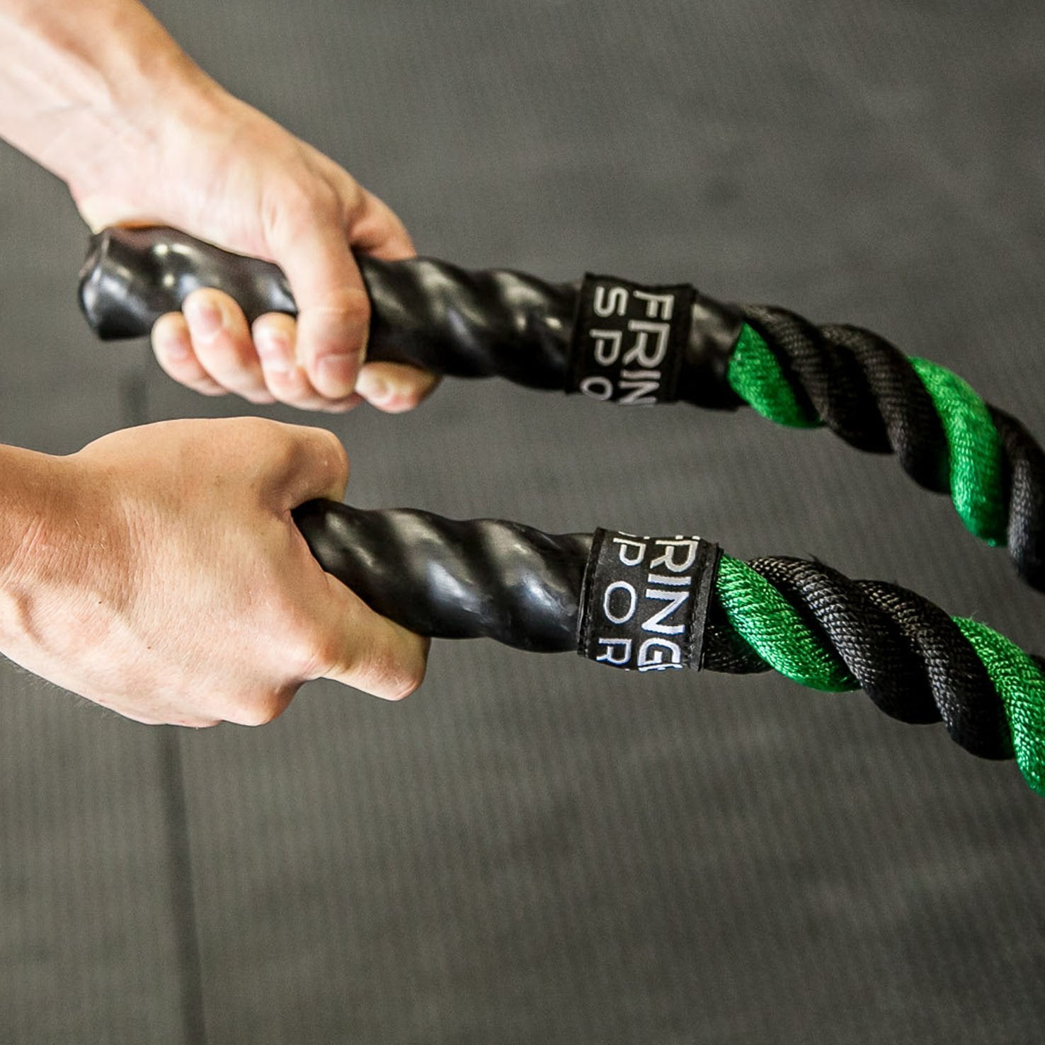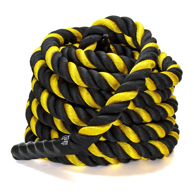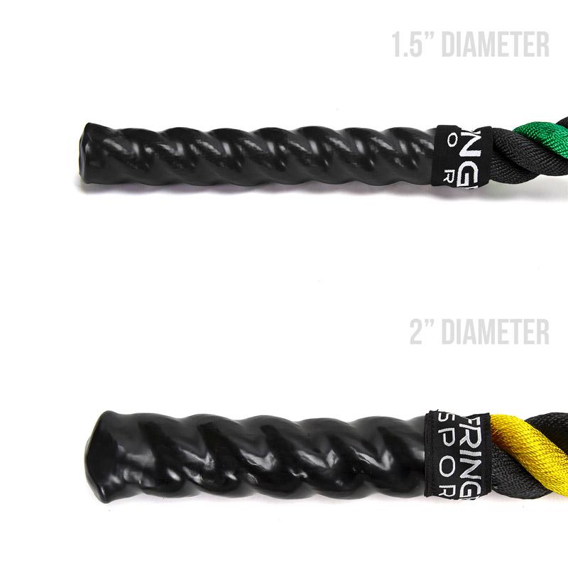- Available in 1.5" or 2" diameter (select above): The 1.5" battle ropes weigh 28 pounds and are an excellent rope for all levels of fitness. The 2" battle ropes weigh 53 pounds and are a better option for heavier trainees or trainees that are strong, with good endurance.