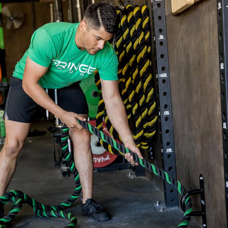 Get a crazy metcon workout with the OneFitWonder battle ropes! These poly battling ropes come in 1.5 or 2 inch diameter so you can choose your level of punishment. Both widths are 50 feet long. To use a battle rope, wrap the middle around a pole (or squat rack, or rig). Grab the free ends and start shopping your arms up and down. You'll feel the burn - and fast!