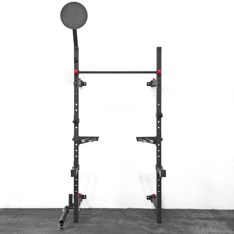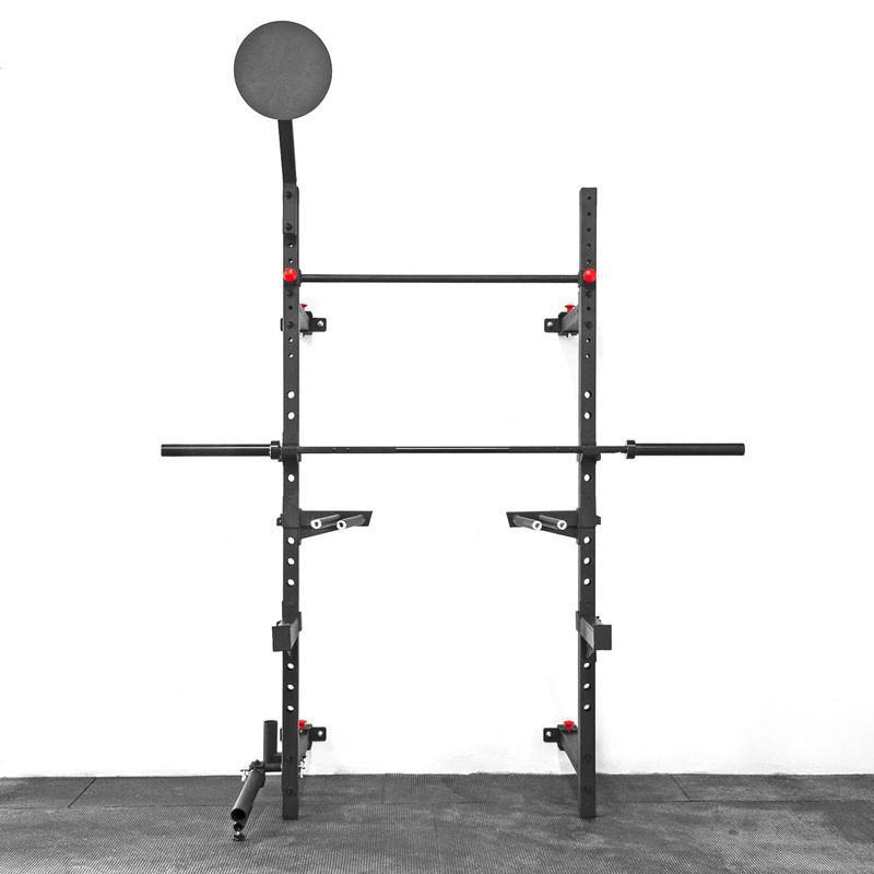 Our Power Rack with Wall Ball Target is the best value when you're tight on space in your garage. The rack easily folds into the wall when not in use and folds out when you're ready to workout. This set comes with a load of accessories to change up your workout and help with storage and space.